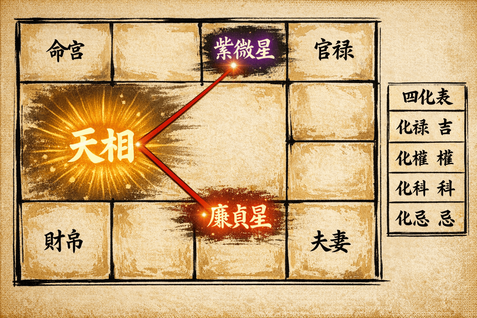 天相星與廉貞星在命盤中永遠是對宮關係(或同宮),這在紫微斗數的結構裡稱為「星曜連動」。廉貞星的四化狀態,直接決定天相星的吉凶走向。
