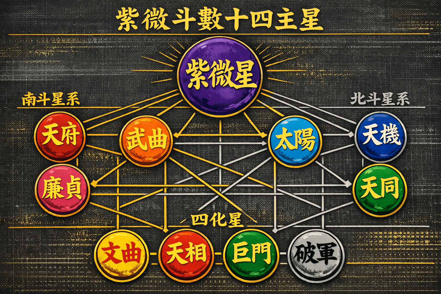 建議先搞清楚十四主星的星系歸屬(北斗/南斗/中天)與基本性格,再學宮位意義,最後才進入四化系統。跳過前兩步直接學四化,會因為基礎不穩而反覆卡關。