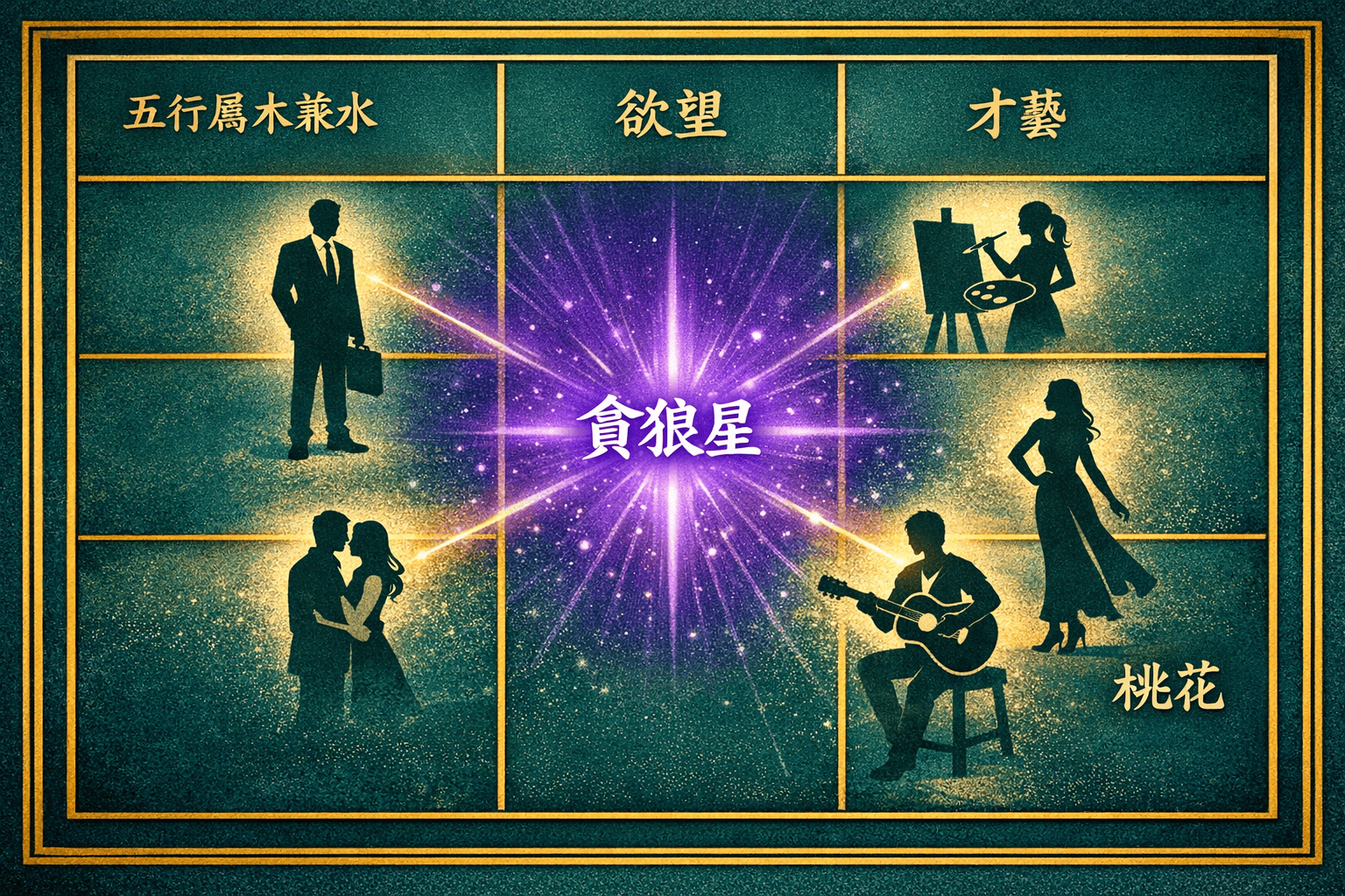 貪狼星是什麼? 在紫微斗數十四主星中,貪狼星是唯一同時兼具「木」與「水」雙重五行屬性的主星,代表慾望、才藝、桃花與多元發展。它不是單純的吉星或凶星,而是一顆「高度情境依賴」的星曜,命盤組合不同,表現天差地別。